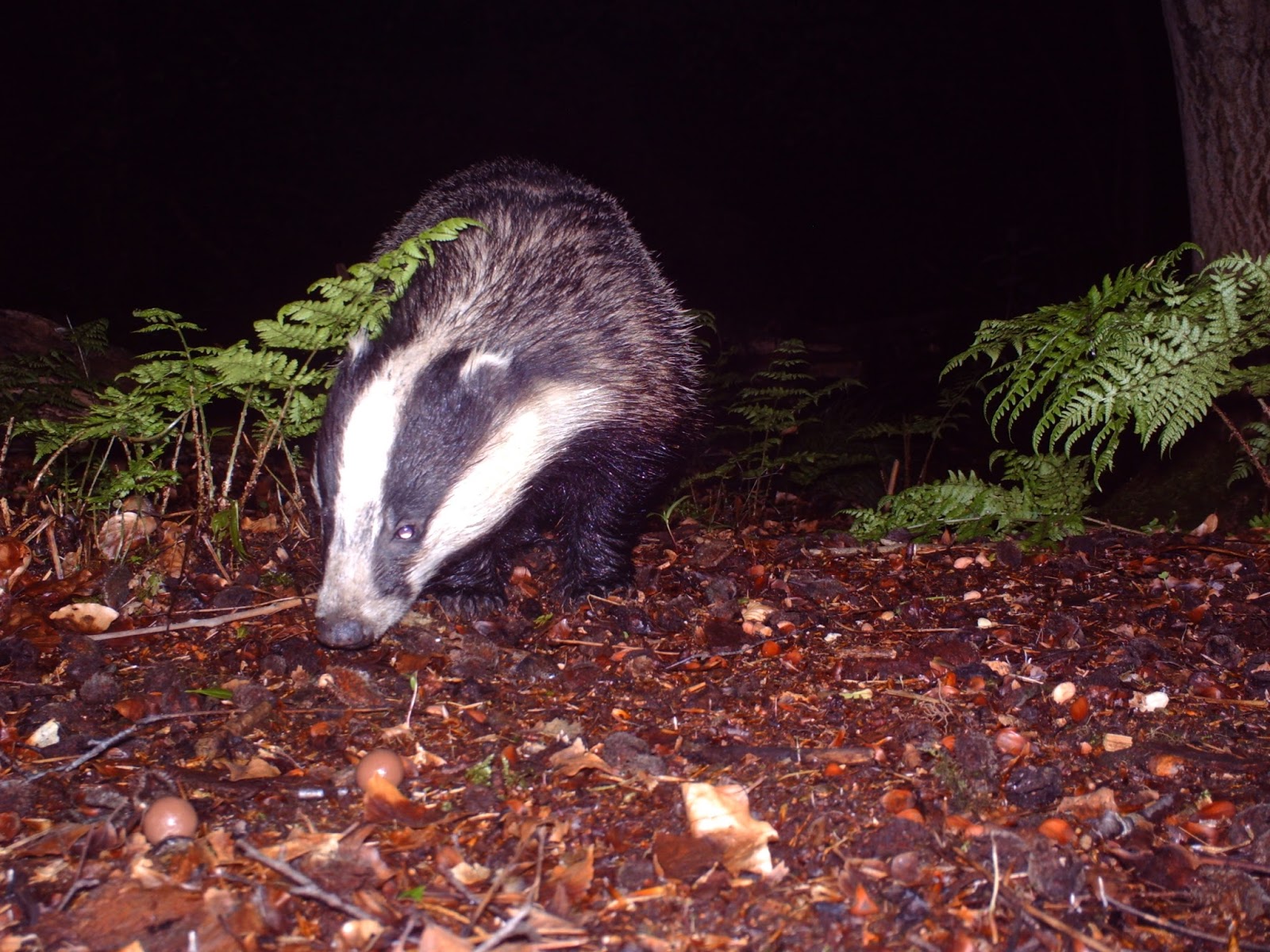 Another night in the woods with the trail camera. As before it was baited with peanuts and Maltesers. The first badger entered stage left. Below you can see a dozen or so Maltesers in front of him.