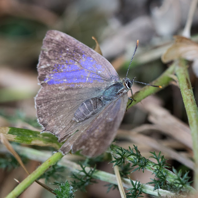Just over a week after my first white-letter hairstreak I have now seen my first purple hairstreaks (Neozephyrus quercus). I was walking through an oak wood with my nephews Joel and Sam when Joel's sharp eyes spotted a butterfly. As it flew off we saw a flash of purple and a few moments later Joel found another one. It is was fairly worn female, with a patch of purple on each front wing as it catches the light.