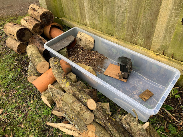 The weasel in the trap was male - broad and muscular. I am learning to recognise them as they are turning up fairly regularly on the cameras. Here is a female, smaller and much slimmer than the male. The Mammal Society website says she weighs 55-70g (only twice as much as a vole or mouse) and he is 105-130g.
