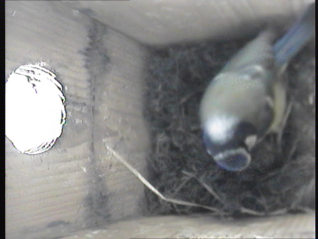 Exciting news from my nest box camera. The box was put up in 2009 and had a nest every year until 2019, first with great tits, once with tree sparrows and for nine years with blue tits. The tree sparrows were a nuisance because they built their nest so the camera couldn't see in, so there is now a 28mm entrance plate over the hole to allow only blue tits access. For the last four years the box was unused, although in one year a nest was nearly completed and then abandoned, probably because a sparrowhawk took the occupant.